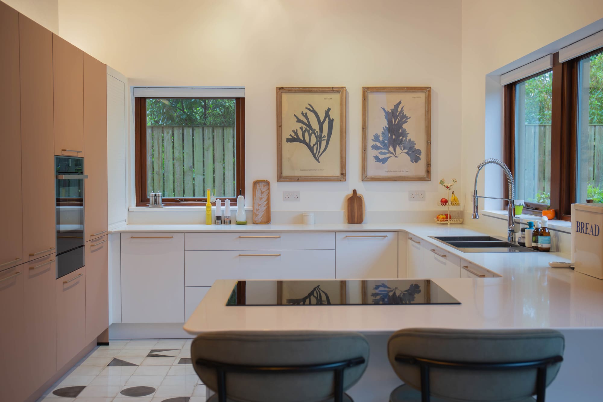 The Fu Kitchen Project involved designing a bright, elegant modern kitchen with a soft, muted colour palette and a strong connection to the surrounding architecture. The clients wanted a contemporary German kitchen that complemented their timber-lined vaulted ceiling and geometric flooring, while offering practical features, efficient storage, and a sociable island layout. A balance of warmth, texture, and simplicity was essential to the brief.