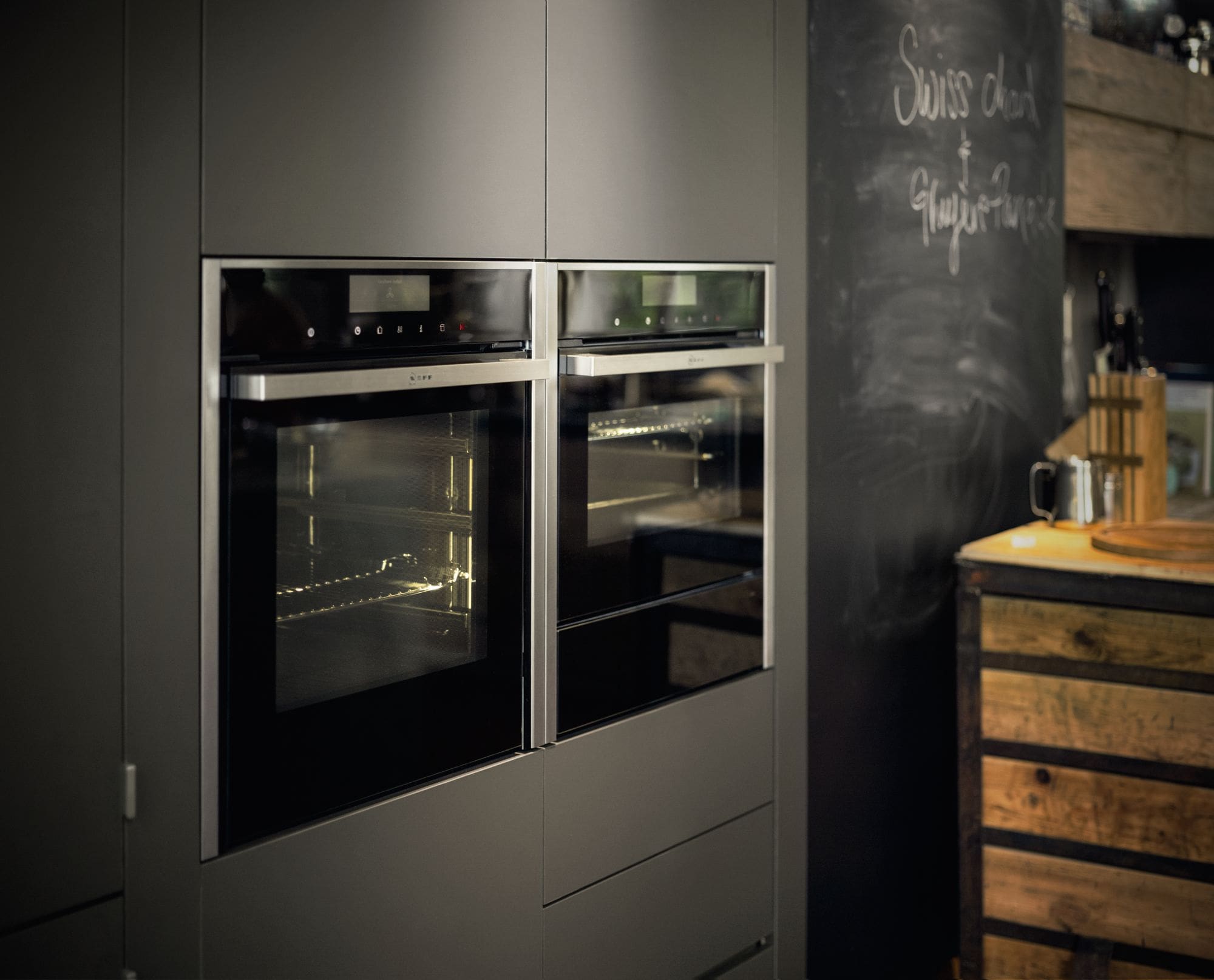 - Built-in ovens sit neatly within the tall unit bank for easy access