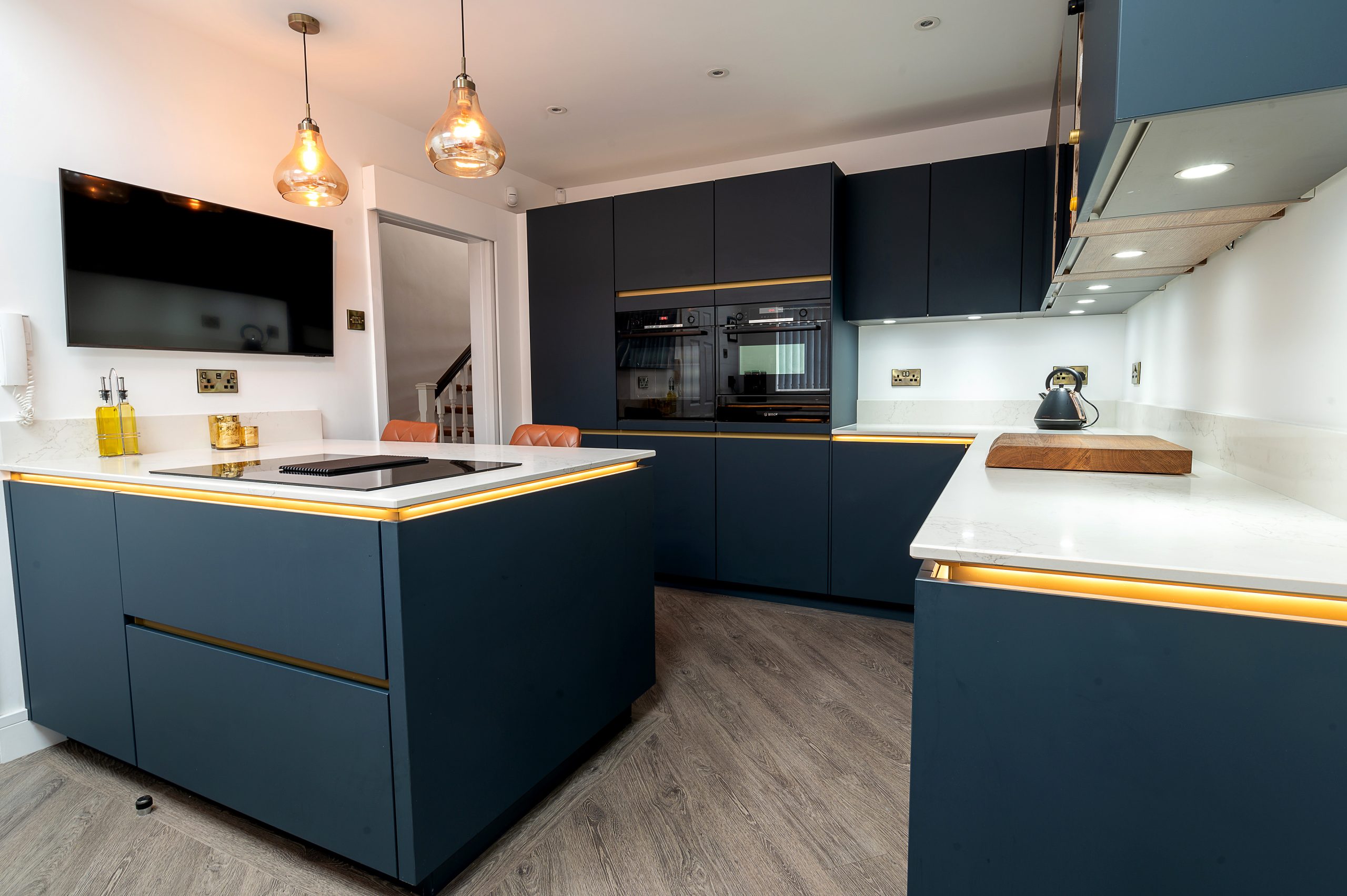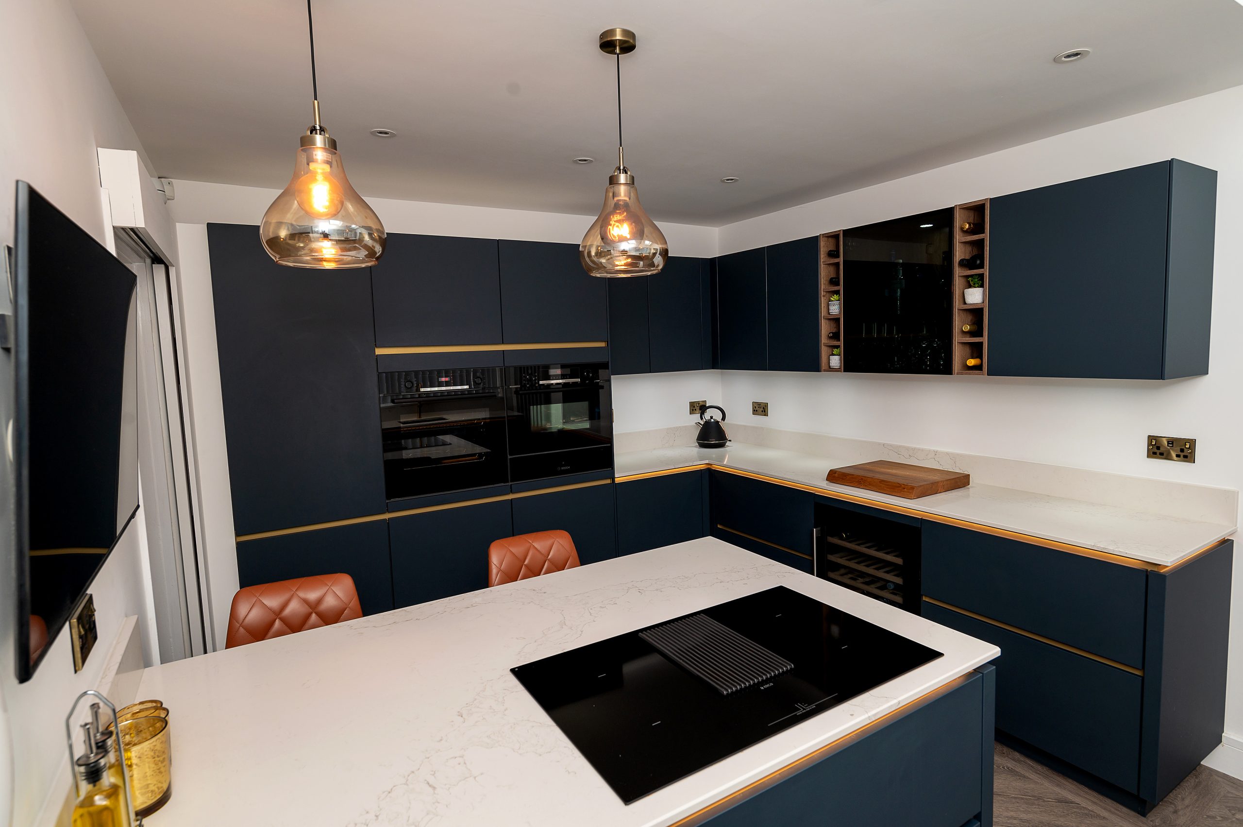 The concept centres around striking contrast: deep navy cabinetry paired with bright, seamless white worktops. The result is a sophisticated, modern look that still feels warm and welcoming. Gold accents and feature lighting add character and bring a sense of personality to the space.
