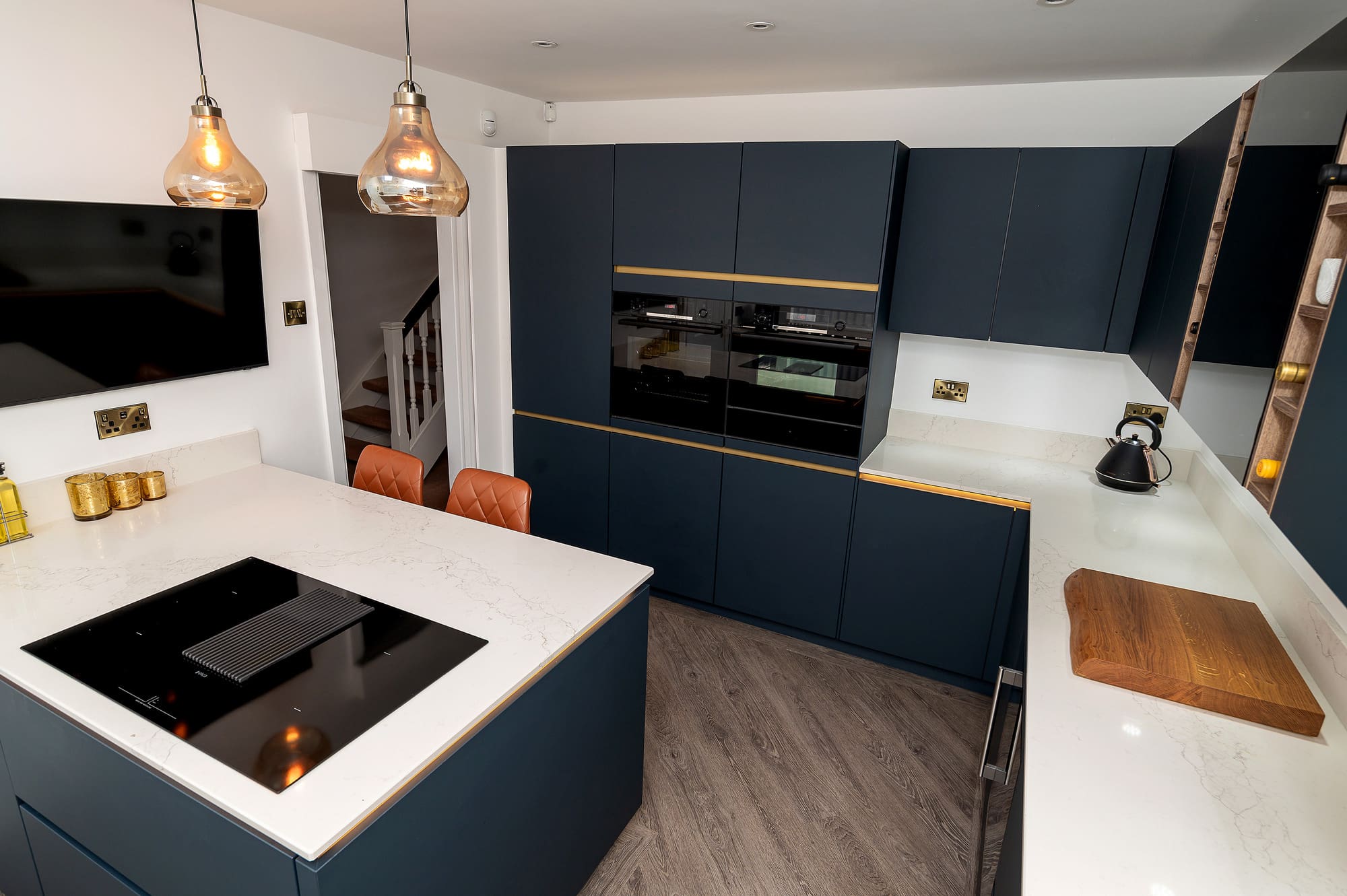 The concept centres around striking contrast: deep navy cabinetry paired with bright, seamless white worktops. The result is a sophisticated, modern look that still feels warm and welcoming. Gold accents and feature lighting add character and bring a sense of personality to the space.